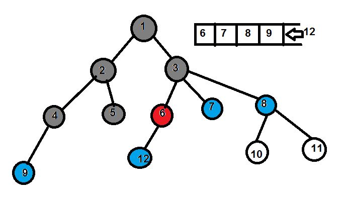 নোড সমূহ- 1, 2, 3, 4, 5, 6, 7, 8, 9, 12 । এখন কিউ এর ফ্রন্টে 10 আছে। 10 কে পপ করি । যেহেতু নোড 10 ভিজিটেড হয়ে গেছে সেহেতু ট্রাভার্সিং প্রক্রিয়া এখানে বন্ধ করি।